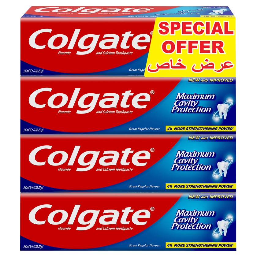 Colgate Maximum Cavity Protection Fluoride 4x75ml toothpaste provides 4x more cavity protection with the added benefit of fluoride. Scientifically formulated and expertly crafted to protect your teeth from cavities, this toothpaste is a must-have for a healthy and confident smile.