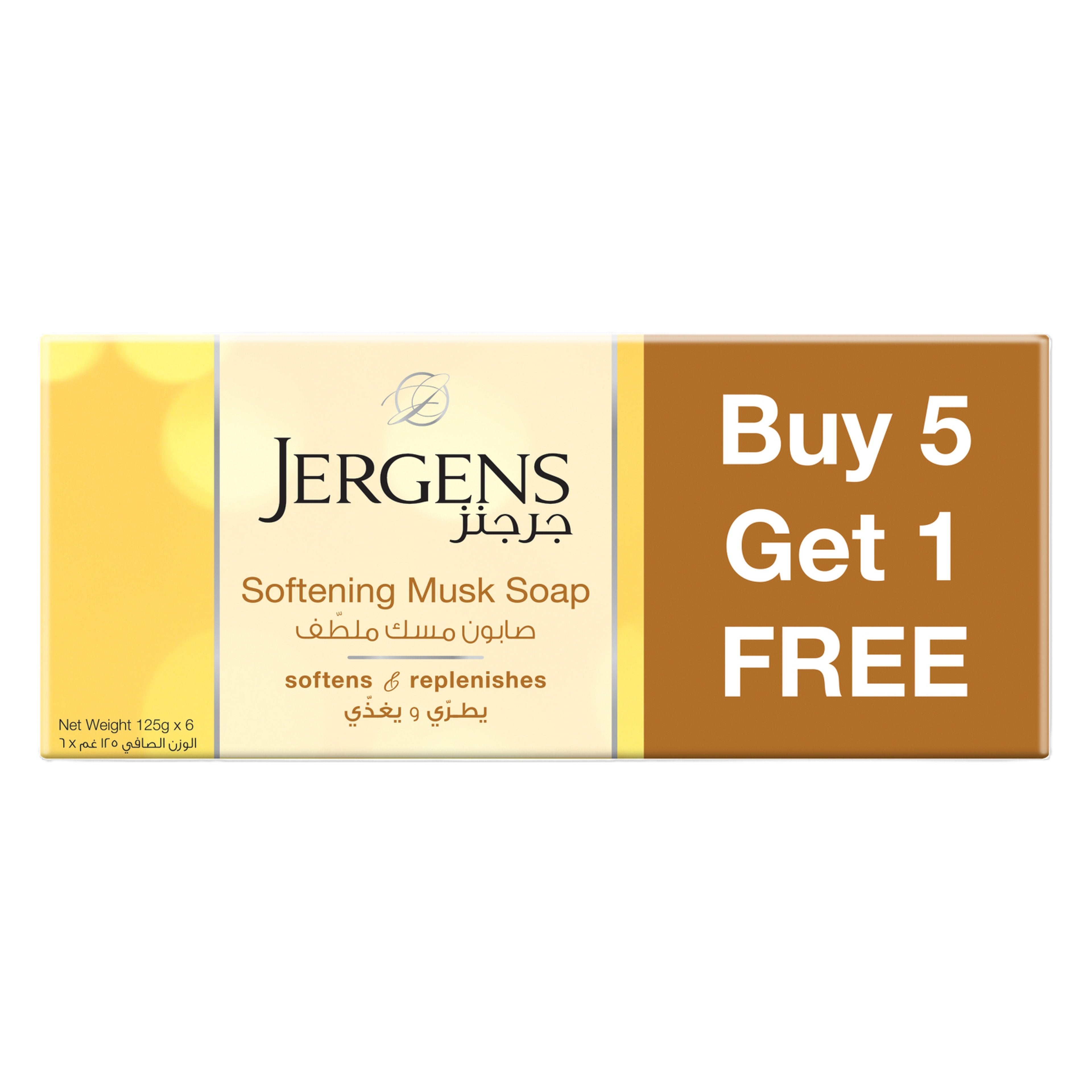Get softer and smoother skin with Jergens Softening Musk Soap. Each pack contains 6 bars of 125g soap, giving you 5 extra bars for free! Formulated with musk essence, this soap nourishes and hydrates the skin while leaving a gentle, lingering scent. Elevate your daily bathing ritual with this indulgent soap.